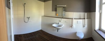 Das Gästehaus "Altes Landhaus" hat eine neue Rampe zm Haupteingang bekommen, der Aufenthaltsraum ist im Erdgeschoss und auch der Zugang zur Terrasse mit Blick zur alten Buche ist mit Rollstühlen selbstverständlich kein Problem.