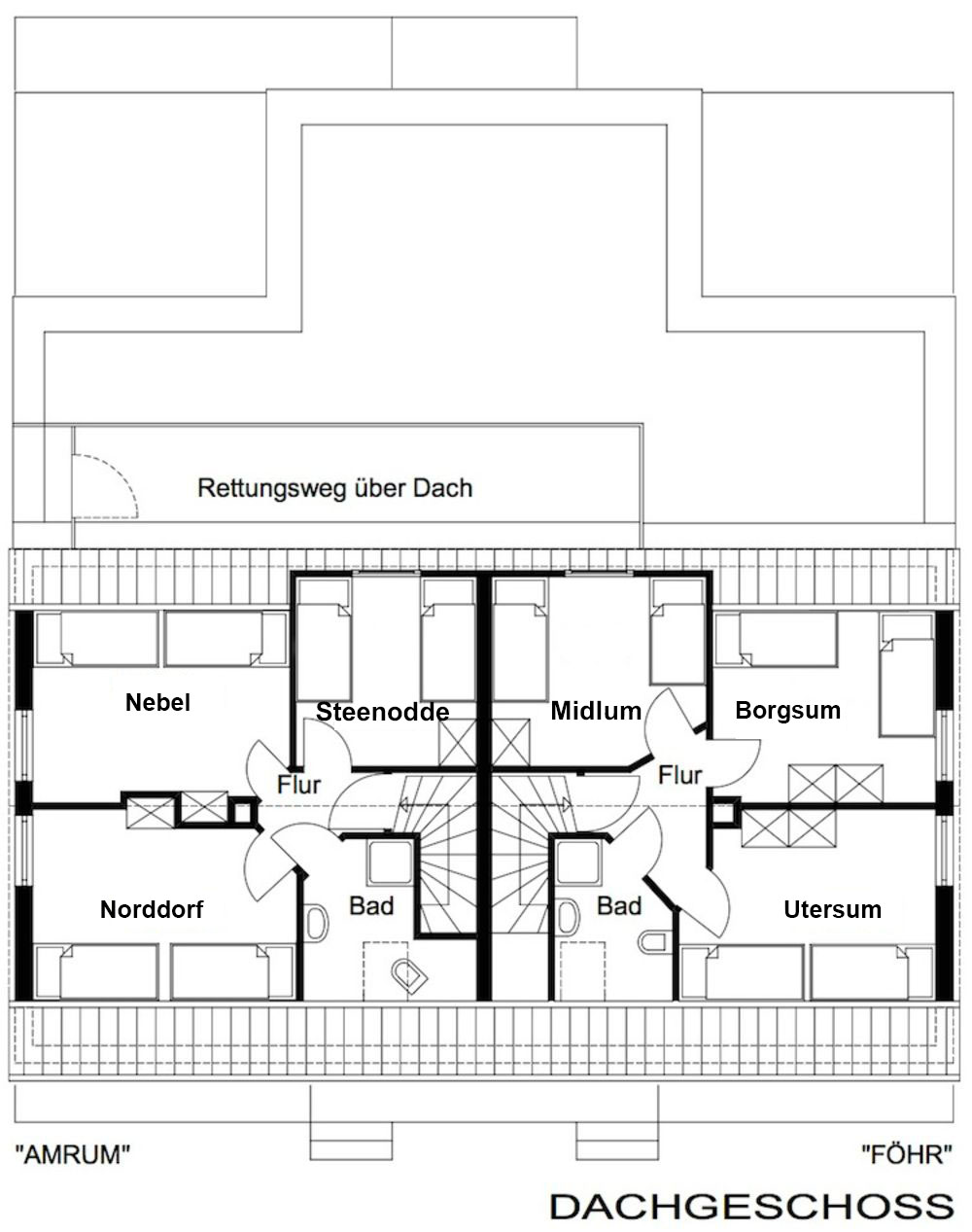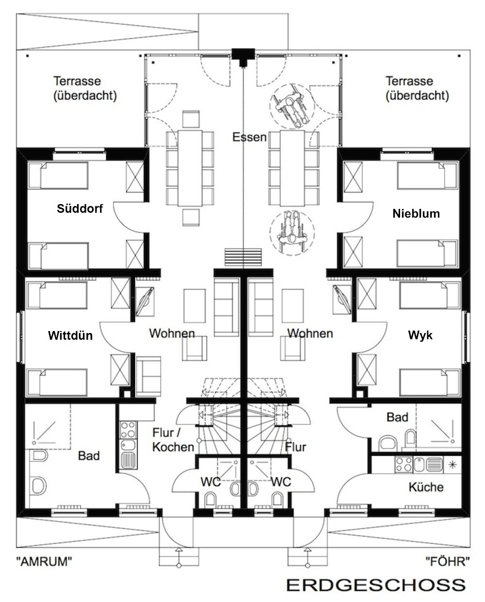 In jeder Haushälfte stehen Ihnen 5 Doppelzimmer, 3 Dusche/WC, je eine davon rollstuhlgerecht, sowie ein Wohn-/Essraum zur Verfügung. Im Erdgeschoß sind zwei große Doppelzimmer rollstuhlgerecht. Die Häuser sind über eine Rampe vorne und hinten stufenlos erreichbar.